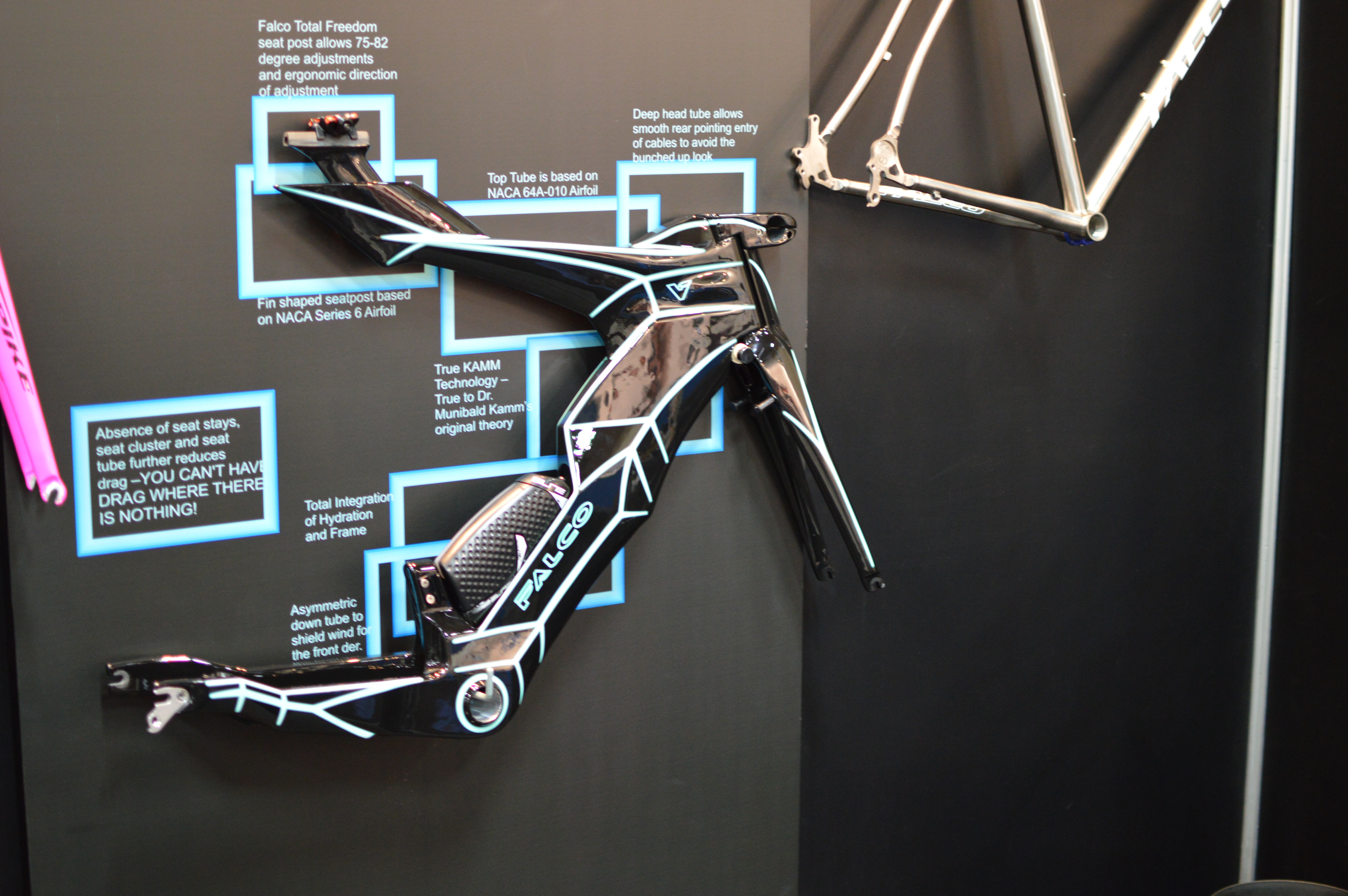 Walking the halls of Interbike we kept hearing comments regarding a new bike that you just had to go take a look at. The bike was located way off the beaten path in a far corner of the hall, but was well worth the effort to go find it. We spent most of our last day on the lookout for the bike, but it wasn’t until the last 30 minutes of the show that we finally found it – but let us tell you, it was well worth the wait. Meet the Falco V!